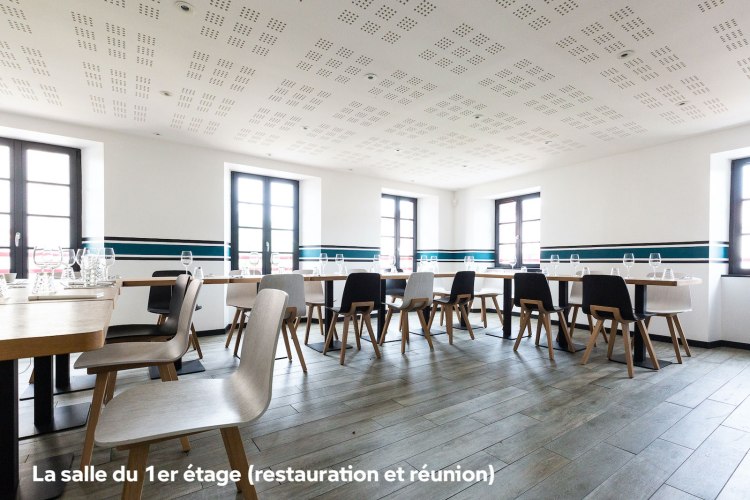 La salle du 1er étage, équipée d’un vidéo-projecteur et d’un écran blanc, offre l’intimité idéale pour vos réunions et repas type banquet. La baie vitrée sur la cuisine lui donne un cachet supplémentaire. La terrasse donnant sur l’église peut s’adapter parfaitement à un apéritif ou la pause-café d’une réunion. Lisa et Gilles, sont à votre écoute pour élaborer le menu de votre événement, servi à l’assiette ou type Buffet.